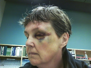 Over the course of the next two days, the bruising migrated across my face and eye, giving me one heck of a glorious technicolour shiner.